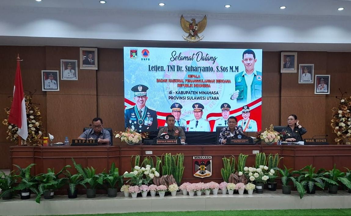 MINAHASA,POSTKOTANEWS.CO.ID – Kepala Badan Nasional Penanggulangan Bencana (BNPB), Letjen TNI Dr. Suharyanto, melakukan kunjungan kerja ke Kabupaten Minahasa, Sulawesi Utara, untuk meninjau langsung dampak banjir yang melanda wilayah tersebut. Kunjungan ini sebagai bentuk perhatian dan kepedulian pemerintah pusat terhadap bencana yang terjadi.Kunjungan kerja tersebut diawali Rapat tatap muka dan mendengar laporan Pemerintah kabupaten Minahasa. Kamis 12 /06/2025.diruang sidang kantor Bupati.