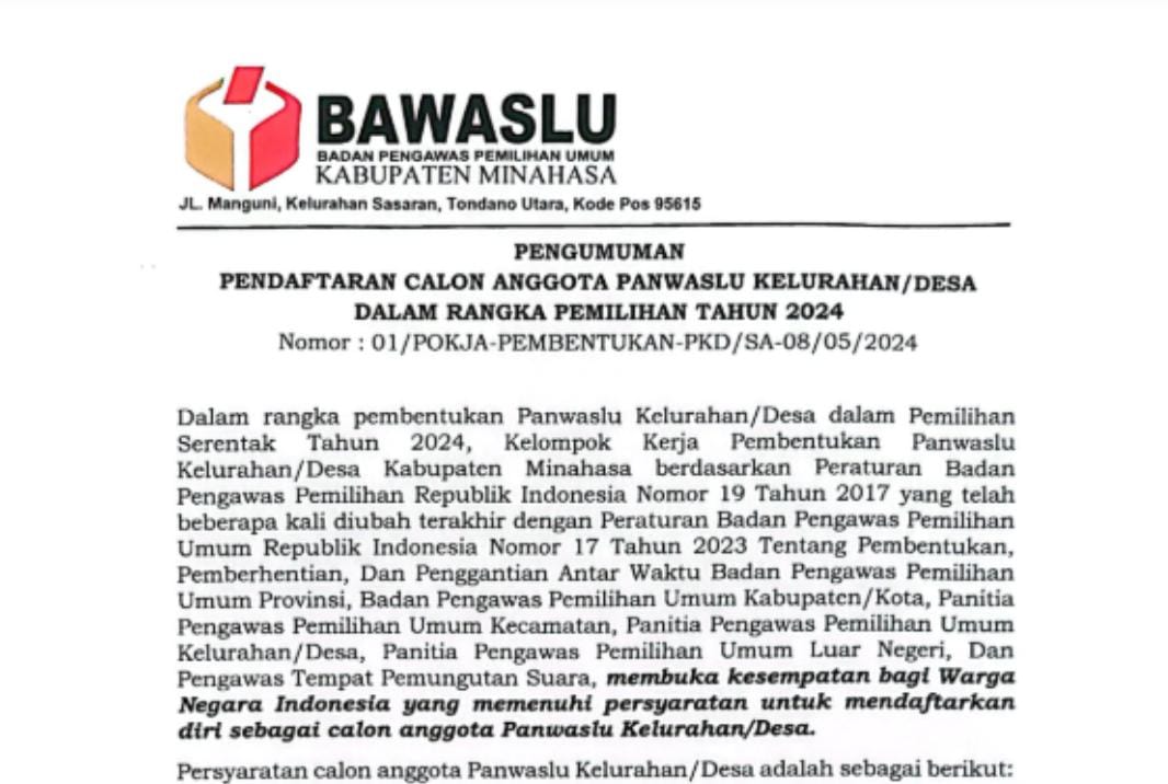BAWASLU KABUPATEN MINAHASA–Pengumuman–Jeffry UnoMei 17, 2024Juli 8, 2024Advetorial, Berita, Minahasa618 Dilihat Post Views: 618 Baca juga: TPID Minahasa Gelar Rakor Bersama Mendagri Bahas Inflasi serta Keamanan dan Ketertiban Umum