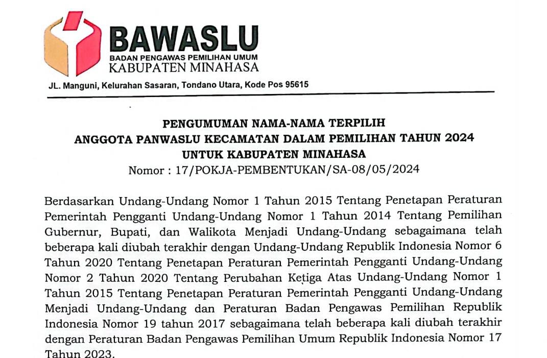 PENGUMUMAN BAWASLU MINAHASAJeffry UnoMei 23, 2024Juli 8, 2024Advetorial, Minahasa532 Dilihat Post Views: 532 Baca juga: BAWASLU KABUPATEN MINAHASA