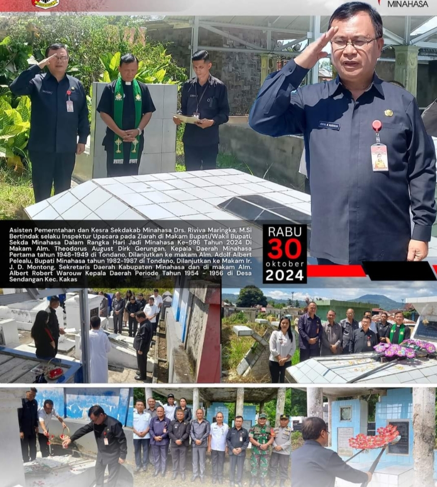Lalu, Asisten I Bidang Pemerintahan dan Kesra Sekdakab Minahasa Drs Riviva Maringka MSi memimpin ziarah di makam Alm Theodorus August Dirk Gerungan, Kepala Daerah Minahasa Pertama tahun 1948-1949, di Tondano. Dilanjutkan ke makam Alm Adolf Albert Pelealu, Bupati Minahasa tahun 1982-1987, di Tondano. Makam Ir J D Montong, Sekda Minahasa, dan di makam Alm Albert Robert Warouw, Kepala Daerah Periode Tahun 1954-1956, di Desa Sendangan Kecamatan Kakas.