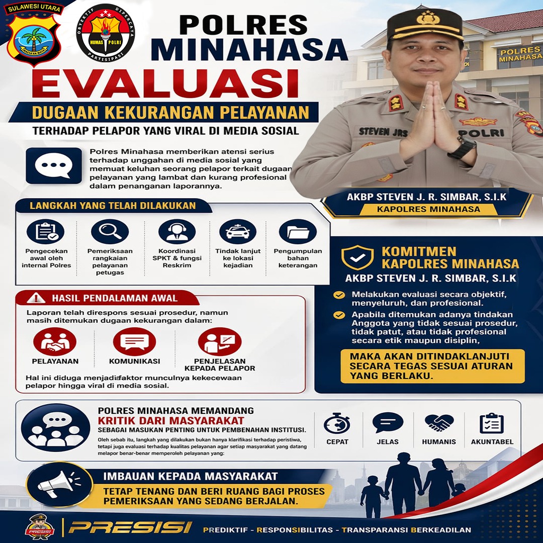 Polres Minahasa menilai kritik publik sebagai bagian penting dalam pembenahan institusi. Tidak hanya fokus pada klarifikasi kasus, evaluasi juga diarahkan untuk meningkatkan kualitas pelayanan agar masyarakat memperoleh layanan yang cepat, transparan, humanis, dan akuntabel.