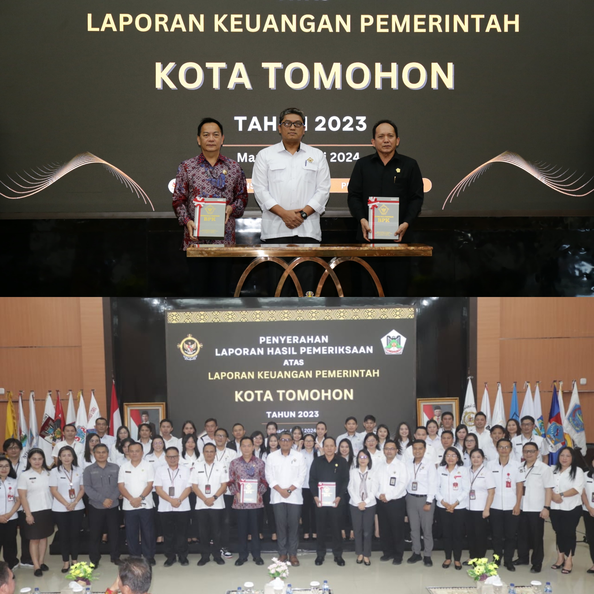 Walikota Tomohon menyampaikan bahwa ini merupakan prestasi yang membanggakan bagi pemerintah Kota Tomohon karena telah menerima kesebelas kalinya berturut-turut mendapat opini Wajar Tanpa Pengecualian (WTP) atas Laporan Keuangan Pemerintah Kota Tomohon Tahun Anggaran 2023 Ini wujud komitmen Pemerintah sebagai bentuk pertanggungjawaban kepada masyarakat Terima kasih kepada seluruh pihak yang telah bekerja keras sehingga kita bisa mendapat opini WTP kesebelas kalinya berturut-turut Kegiatan Penyerahan Serentak LHP atas LKPD Kabupaten Kota Se-Provinsi Sulawesi Utara.